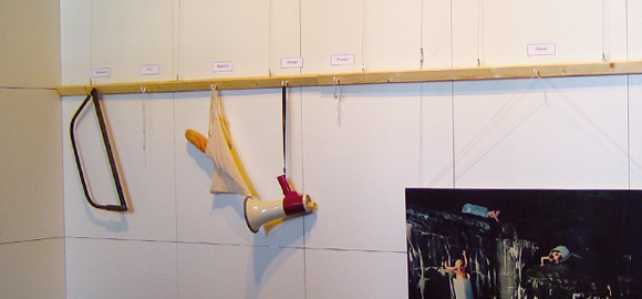Werke liegen auf dem Boden, verschwinden unter einem Geldhaufen oder von mehreren Werken ist nur eines sichtbar, da diese effizient an einem Hacken aufgehängt wurden. Der Besucher, der die Kunstwerke betrachten will, muss sich auch mit den Inszenierungen ausseinandersetzten: Werke befinden sich auf dem Boden, verschwinden unter einem Geldhaufen oder von mehreren Werken ist nur eines sichtbar, da diese effizient an einem Haken aufgehängt wurden. Teilweise kann er sich der Kunst an anderer Stelle aktiv nähern, oder er muss eine Entscheidung über sein eigenes Verhalten treffen: läuft er über das Bild, das im Weg liegt, oder nimmt er einen Umweg in Kauf. An anderer Stelle kann er nichts unternehmen, aber kann sich Gedanken zu der vorherrschenden Situation machen und sich eine Meinung bilden.